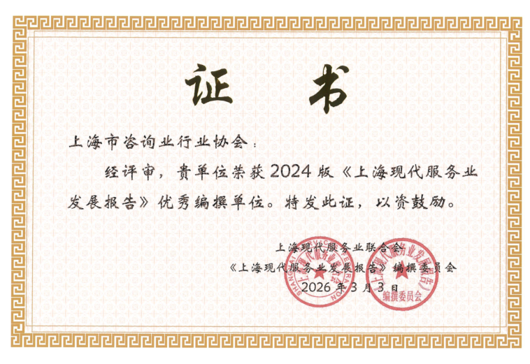 此次获评是上海现代服务业联合会对协会编撰工作的充分肯定,协会将继续深化行业研究,提升专业能力,助力咨询行业高质量发展。